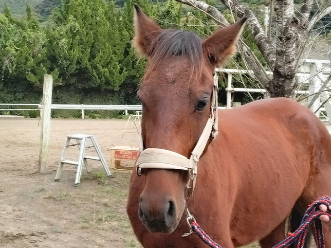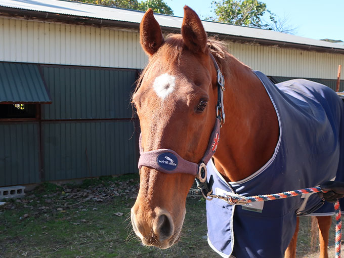 小柄な栗毛の馬。新しい環境にも動じる様子はありません。オールマイティに活躍できる乗用馬を目指します!